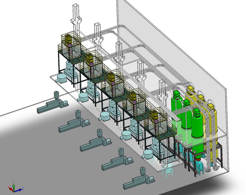 本產品為多種原料配方自動計量磅秤,該上料輔機系統將原料區與生產區分離,采用真空吸引輸送技術,幫助客戶降低設備及建筑成本,減少人工,并實現清潔生產。該系統采用中央控制體系,技術員可于中控箱的操作面板上直接控制、檢查全套設備的工作情況。